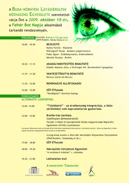 A civil szervezet nagyszabású rendezvényét két budaörsi helyszínen, az Ifjúsági Klubban, illetve a Jókai Mór Művelődési Központban tartják. A programok között szerepel akadálymentesítési és vakvezető kutya bemutató, rendhagyó állófogadás és "söt-étkezde", érzékenyítő tréning és demonstráció, Braille tanfolyam, a Vakrepülés Színjátszó Egyesület bemutatója, valamint láthatatlan buli is.