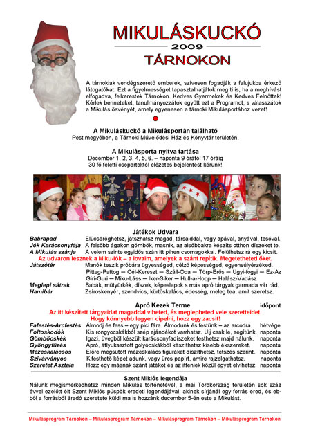 Éppen az elmúlt esztendőben költöztem a csendes kis falucskába, Tárnokra. Most építjük manó-immal azt a Mikulásportát, ahol majd engem is felkereshettek az óvónénik, tanító nénik vagy szü-leitek kíséretében. Jöhettek busszal, kerékpárral, autóval, gyalog. Mindegy, csak gyertek!