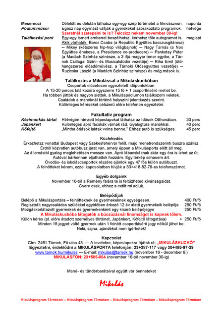 Leveleiteket a Tárnoki Művelődési Ház és Könyvtár, 2461 Tárnok, Fő utca 43. címre várom. A bo-rítékra írjátok rá: "MIKULÁSKUCKÓ". Kívánságaitokat a Remény falára személyesen is rátűzhe-titek. November 16-a és 30-a között, napközben a 23+585-064-es tele¬fonszámon elérhettek. Ha a kagylót manó vagy tündér veszi fel, velük is beszélhettek bizalma¬san. Bővebb információ a Miku-lás-Programban és Tárnok honlapján olvasható, vagy a 23+387-117-es telefonszámon kérhető. A személyes találkozásig baráti öleléssel köszönt mindannyiótokat: