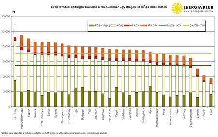 Az adatokból összeállított diagram arról árulkodik, hogy Százhalombattán viszonylag alacsony a távfűtés díja, de annál azért nem olcsóbb, mint ha egy jó hatásfokú (a diagramon 90 százalékosként jelzett) kazánnal, egyedileg oldanánk meg a fűtést.