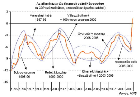 A politikusok persze ilyenkor szokták elengedni a gyeplőt, aminek eredménye egy újabb eladósodás és kezdődik elölről a megszorítás. Mindenesetre figyelemre méltó, hogy a jelenlegi kampányban nemigen hallani konkrét ígéreteket, legfeljebb a házi pálinkafőzés engedélyezését (ez kell a magyarnak; annyi bögrecsárda lesz itt, mint a nyű és magam is nyitok egyet). Bíztató az is, hogy a PIGS ("disznók") országoknak – Portugália, Írország, Görögország és Spanyolország – a GDP arányában vett 90-120 százalékos eladósodottsága és a körülöttük dúló viharok rendkívüli fegyelmező erővel kell, hogy hassanak a jelenlegi és leendő legfőbb döntéshozóinkra; elegendő egy hibás döntés vagy ígéret, és egyből oda a piacok bizodalma.