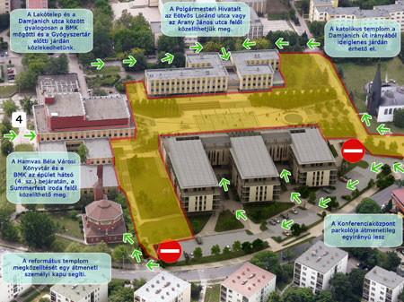 A lezárás néhány hónapos ideje alatt a Polgármesteri Hivatal hátulról, az Arany János utca vagy az Eötvös Lóránt utca felől lesz megközelíthető. A sétányok és a Damjanich út között gyalogosan a BMK mögött, vagy a Gyógyszertár előtt tudunk majd közlekedni. A művelődési házat és a könyvtárat a hátsó, 4. sz. bejáraton át közelíthetjük meg. A református templomba a Damjanich utca felől, egy ideiglenes kapun át lehet majd bejutni, a katolikus templomhoz pedig a főbejárathoz vezető ideiglenes járdát alakítanak ki. A konferenciaközpont és lakások mögötti nagy parkolót már használhatják az autósok, az építkezés idején azonban egyirányú lesz a forgalma.