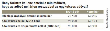 Látható, hogy csak a minimálbéreseknél – és ez hozzávetőleg 800.000 foglalkoztatottat jelent, aminek a fele esetében igaz az, hogy a minimálbér a munkaerő piaci ára – havi 20 ezer forinttal kellene a munkaadónak megemelnie az alapbért. Az alapbéremelés viszont a járulékok (a bér 35 %-a) növekedését is jelenti, azaz a munkaadónál egy minimálbéres "kompenzálása" éves szinten 325.000 forint többletköltséget jelent. Ha ezt kiszorozzuk a 400.000 igazi minimálbéressel, akkor az eredmény 130 milliárd forint. Ha ehhez hozzáadjuk a magasabb jövedelmű kategóriák kompenzálási igényét, akkor valahol 300-350 milliárd forint magasságában járunk; ezt a költségnövekményt pedig a foglalkoztatóknak kell állniuk, akik – a jelen esetben – a hazai kis- és középvállalkozások, továbbá az állami- és önkormányzati vállalatok (a multinacionális vállalatokat az egész nem érinti, ugyanis esetükben az átlagos bérszínvonal meghaladja a kritikus 250.000 Ft/hó értéket).