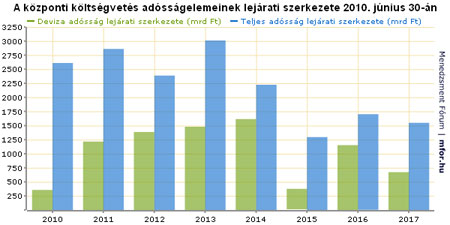A kormányzat – az önkormányzatok egy ezer milliárd forintos eladósodottságát nem tartalmazó – teljes törlesztési kötelezettségét viszont az alábbi diagram mutatja: