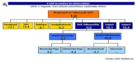 A GDP-t lehet számolni a "termelési" oldalról (sárga), de lehet a "fogyasztási" oldaláról is (kék szín). Látható, hogy a növekedés egyedüli forrása a feldolgozóipari termelés (a multinacionális cégek) és ez a terméktömeg exportra kerül.