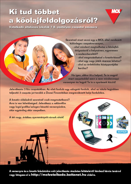"Ki tud többet a kőolajfel-dolgozásról" címmel versenyfelhívást tett közzé Százhalombatta és Ercsi általános iskolái részére a MOL Nyrt. A verseny célja, hogy a tanulók jobban megismerjék Százhalombatta meghatározó ipari üzemének a működését, felkeltse érdeklődésüket a természettudományok, elsősorban a kémia iránt, továbbtanulásuk során hasznosítsák azokat a kőolajiparra vonatkozó ismereteiket, amelyeket a vetélkedőre történő felkészülés során szereztek.