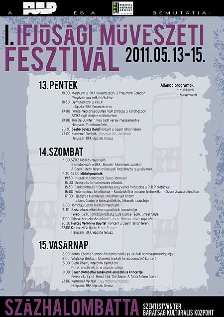 Első alkalommal rendez Ifjúsági Művészeti Fesztivált a PULP civil ifjúsági kezdeményezés és a Barátság Kulturális Központ Százhalombattán május 13-15-én. A három napos rendezvénysorozat keretében a helyi fiatalok tehetségét és kreativitását, sokszínű kulturális életét ismerhetik meg a látogatók.