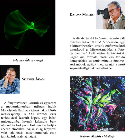 Katona Miklós divat- és aktfotósként ismertté vált művész, 24 éven át az MTV operatőre volt. Kimeríthetetlen kreatív erőforrásokról tanúskodó új kifejezésmóddal, a "fotó-festménnyel" kelti életre fantáziánkat. Selymes Ádám így beszél alkotásairól: "A fényművészet korunk és egyaránt a modernizmusban útjának indult Moholy-féle Bauhaus ideáknak a közös metszéspontja. A XXI. századi, lézertechnikával készült képek egy belső univerzumba hívnak kalandra bennünket, és l'art pour l'art módon tartják éberen elménket. Az új világ lényeivel való találkozás misztikumának csak fantáziánk szabhat határt."