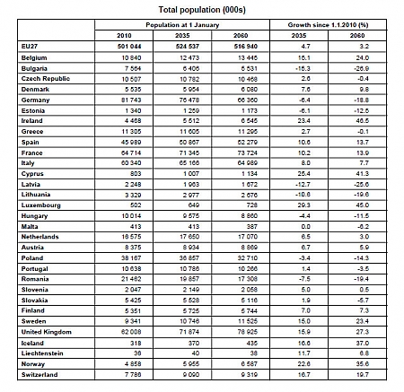 Ami reálisnak tűnik, az a 2035-re vonatkozó adatsor. Habár mintegy 5 %-os lélekszám-gyarapodást mutat az előrejelzés, de ennek az eloszlása igen érdekes képet mutat. A nyugati centrum országok - kivéve Németország -, továbbá a déliek lakossága nő, míg a közép- és kelet-európai országoké csökken. A növekedés-csökkenés okát vallásfelekezeti alapon beazonosítani nem lehet (a mélyen katolikus Lengyelország ugyanúgy szenved, mint az ortodox Románia), de a gazdasági fejlettség szintje sem ad egyértelmű eligazítást.