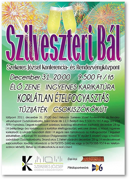 Fergeteges Szilveszteri Bál a Szekeres József Konferencia- és Rendezvényközpontban! Búcsúztassa Százhalombatta egyik legjobb bulijában az Óévet! Egész éjjel zenél a Coctail Party Zenekar! A finom ételeket - melyből korlátlanul fogyaszthat - a Halászcsárda biztosítja. Lesz csokiszökőkút, karikaturista, tűzijáték. A belépőjegy ára: 9500 Ft. A belépőjegyek előjegyezhetőek a 0670/395-2440-es telefonszámon!