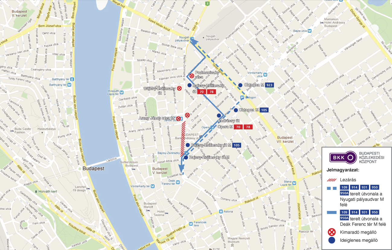 A lezárás ideje alatt a 109-es, 914-es, 931-es, 950-es és 950A jelzésű autóbuszok terelőútvonalon közlekednek, a Nyugati pályaudvar felé a Károly körút – Andrássy út – Oktogon – Teréz körút útvonalon, így nem érintik az Arany János utca M és a Podmaniczky utca megállókat. Helyettük ideiglenesen a Bajcsy-Zsilinszky úton, a Paulay Ede utca torkolatánál lévő ideiglenes megállóhelyen; az Oktogonnál 105-ös buszok és a Teréz körúton az Oktogon (Aradi utca) megállóhelyen a 923-as autóbuszok megállóhelyén állnak meg a buszok.
