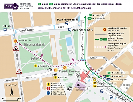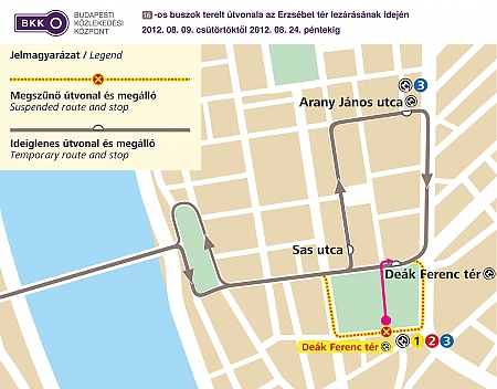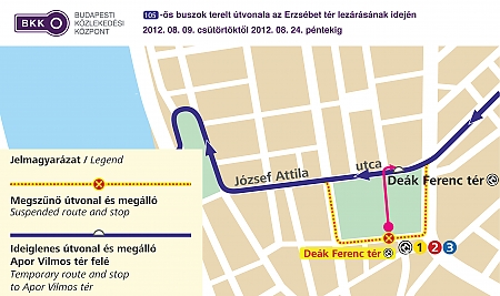 Az V. kerületben a "Főutca-programban" megújított útszakaszok garanciális kivitelezési munkái 2012. augusztus 9-én, csütörtökön kezdődnek el. Az építési folyamatok első ütemében augusztus 9-étől várhatóan augusztus 24-éig, péntekig lezárják az Erzsébet teret. Ebben az időszakban a 15-ös és 115-ös, a 16-os és a 105-ös autóbuszok módosított útvonalon közlekednek.