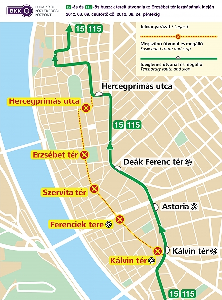 A 15-ös és 115-ös autóbuszok terelve közlekednek, a Kálvin tértől a Bank utcáig a Múzeum körút – Károly körút – Bajcsy-Zsilinszky út útvonalon a Lehel tér M felé. A Lehel tér M irányába tartó 15-ös és 115-ös autóbuszok ezért nem érintik a Kálvin tér M, a Ferenciek tere M, a Szervita tér, az Erzsébet tér és a Hercegprímás utca megállóhelyeket. A terelt útvonalon közlekedő járatokra a 9-es, illetve 109-es autóbuszok Kálvin tér M, Astoria M, Deák Ferenc tér M megállóiban, majd a Bank utcában, a Hold utca kereszteződése előtt (a Hercegprímás utca elnevezésű ideiglenes megállóban) lehet felszállni. A Boráros tér H irányába tartó 15-ös, illetve 115-ös buszok eredeti útvonalukon, a menetrendben meghirdetett megállóikat érintve közlekednek.