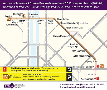 A fenti napokon, szeptember 1-jétől 9-éig minden este 21:40-től üzemzárásig 1V villamospótló autóbusz közlekedik a Bécsi út és a Puskás Ferenc Stadion között. A villamospótló autóbuszra az alábbi megállókban lehet felszállni: