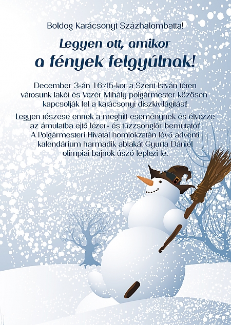 Idén is közös fényfelkapcsolásra várja az Önkormányzat a százhalombattaiakat december 3-án a Szent István téren. A tavalyi évhez hasonlóan idén is lélegzetelállító lézer show-val, ünnepi dalokkal, fényekkel és óriási adventi naptárral indul az ünnepre hangolódás városunkban.