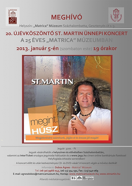 2013. január 5-én (szombaton) este 19 órakor "St. Martin megint.... Húsz" címmel újévköszöntő ünnepi koncertre várják a zenekedvelőket a százhalombattai "Matrica" Múzeumban. Mára hagyománnyá vált, hogy az arany-platina- és gyémántlemezes, eMeRTon-díjas művész koncertezik a római kori település nevét viselő Múzeum falai között. (ejtsd: mátrika). A különleges hangulatú Múzeum, mely nem "matricákat" rejt, hanem a település több tíz ezeréves történelmi múlt emlékekeit, 25 éves jubileumi születésnapját ünnepli. Az ünnephez kapcsolódik St. Martin újévköszöntő koncertje is melyen 20. jubileumi albumát is megismerheti a hallhatóság. Most is különleges zenei világába kalauzolja a közönséget.