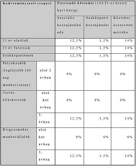 A Munkahelyvédelmi Akcióterv megvalósításához kapcsolódó törvénymódosítások a munkaerő-piaci szempontból hátrányos helyzetű munkavállalók foglalkoztatóinak a meglévő munkahelyek megőrzése és új munkahelyek létesítése érdekében az alábbi táblázatban összefoglalt, jelentős mértékű szociális hozzájárulási adókedvezményt és szakképzési hozzájárulási kedvezményt nyújtanak.