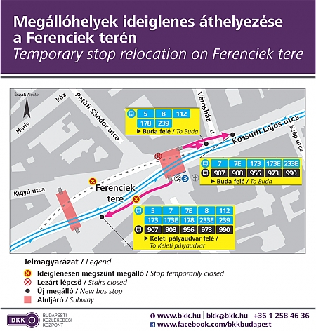 - az 5-ös, 8-as, 112-es, 178-as, 239-es jelzésű autóbuszok részére az eredeti megállóhelytől kb. 100 méterrel hátrább, a Városház utca kereszteződése után, a gyalogos aluljáró lépcsőjénél kerül kialakításra az ideiglenes megálló.