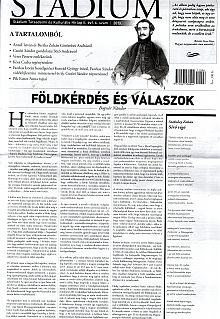 A magyar földről és tájról való gondolatok és tűnődések mellett Veres Péterre emlékezik a Stádium legújabb száma. Bertha Zoltán irodalomtörténész és Antall István kritikus a nemrég elhunyt Görömbei Andrásrt méltatja. Csoóri Sándor költő Sütő Andrásról mondta el gondolatait bölcsészhallgató unokájának, Csoóri Annának. A vezércikket Bognár Nándor írta, aki az új földtörvény pozitívumaira hívja fel az olvasók figyelmét. A szülőföldhöz való viszony kérdésében Fazekas István Konrád György írót, Csoóri Sándor népzenészt és Fazekas Sándor vidékfejlesztési minisztert szólította meg. Ötvös László református lelkész Veres Péter kálvinizmusáról írt rendhagyó tanulmányt. A lapban Szokolay Zoltán, Bátai Tibor, Csontos Márta, Gál Csaba Sándor, Szentmihályi Szabó Péter és Oláh András versei mellett Kósa Csaba regényrészlete és Ballai László novellája olvasható. Arany Lajos Király Istvánról írt vidító stílusparódiát. Jónás Ágnes Pintér Tiborral beszélgetett a musical- és operettszínészet érdekességeiről és a lovaglásról. Bakonyi István Gál Csaba Sándor verseskötetét mutatja be, ugyanakkor rövid interjút olvashatunk Cseh Péter százhalombattai mérnök díjnyertes dokumentumfilmjéről is. Pék Eszter Anna rajzai mellett a lapnak ezt a számát Stekovics Gáspár fotói színesítik.