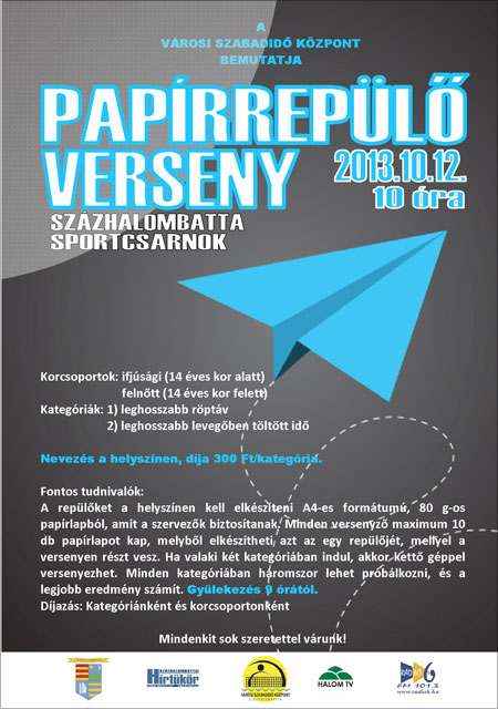 Papírrepülő verseny Százhalombattán 2013.10.12-én 10 órakor a Városi Sportcsarnokban!