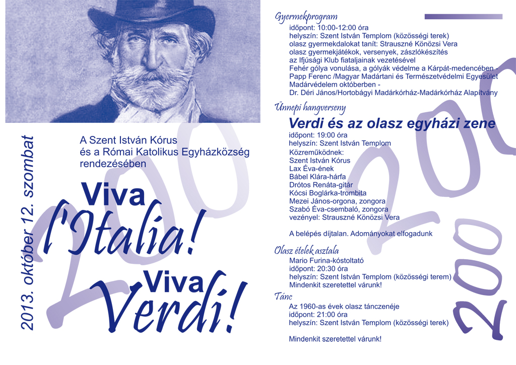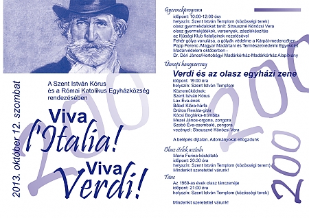 Viva l’Italia, viva Verdi címmel egész napos kulturális programot szervez a Szent István Kórus és a Római Katolikus Egyházközség a nagy olasz zeneszerző születésének kétszázadik évfordulója alkalmából október 12-én, Százhalombattán.