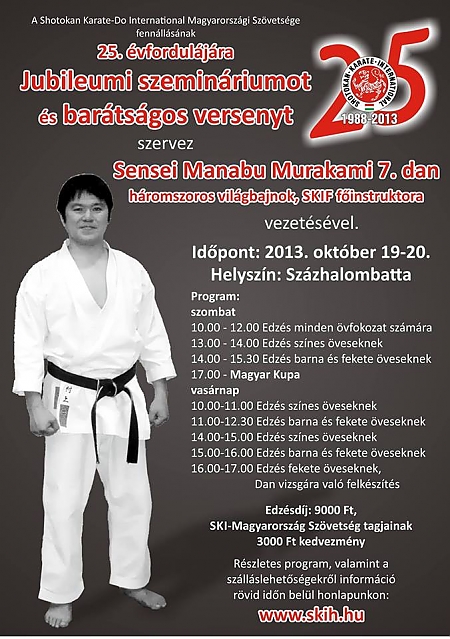 Az SKI Magyarországi Szövetsége megalakulásának 25. évfordulója alkalmából hazánkba látogat a világszövetség japán főinstruktora. A 7. Danos Manabu Murakami mester, háromszoros világbajnok és a japán válogatott edzője, a százhalombattai Városi Sportcsarnokban tart edzéseket október 19-20-án, szombaton és vasárnap.
