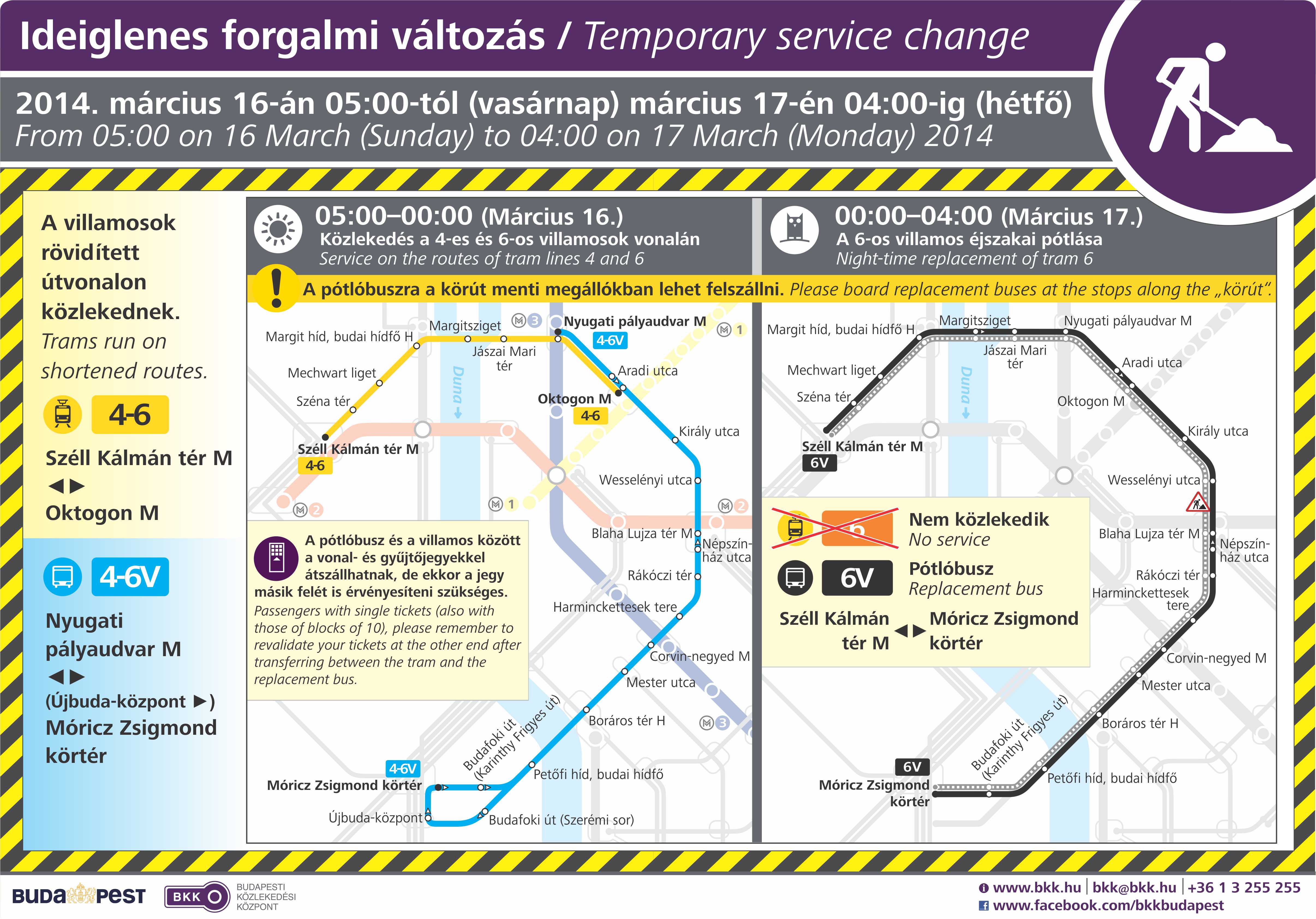 2014. március 16-án (vasárnap) a 4-es villamos 5:00-tól az utolsó járatindulásig, az – éjjel-nappal közlekedő – 6-os villamos pedig 5:00-tól éjfélig rövidített útvonalon, a Széll Kálmán tér M végállomástól az Oktogon M megállóhelyig közlekedik, 4-6 számjelzéssel. A Móricz Zsigmond körtértől, Újbuda-Központ érintésével a Nyugati pályaudvar M megállóhelyig villamospótló busz jár 4-6V jelzéssel a Nyugati pályaudvar–Nyugati tér–Teréz körút–Erzsébet körút–Blaha Lujza tér–József körút–Ferenc körút–Boráros tér–Petőfi híd–Goldmann György tér–Irinyi József utca–Október 23. utca–Fehérvári út–Móricz Zsigmond körtér–Karinthy Frigyes út–Irinyi József utca–Goldmann György tér–Petőfi híd–Boráros tér–Ferenc körút–József körút–Blaha Lujza tér–Erzsébet körút–Teréz körút–Nyugati tér–Nyugati pályaudvar útvonalon. A pótlóbuszra az alábbi megállókban lehet felszállni: