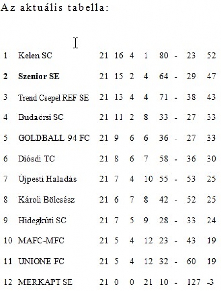A százhalombattai Szenior SE legutóbbi bajnoki mérkőzésének eredménye: Szenior SE – UNIONE FC 4-1 (3-0) Nagytétény, június 2., 20 néző. Vezette: Szemők (Szabó, Vértes)