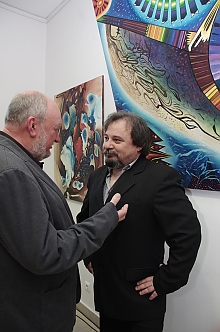 A városunkban élő képzőművész egy éve ismerte meg Nadezsda Gladkih-t, a Krími Magyar Társaság alapító elnökét, aki egy pilisvörösvári tárlaton figyelt fel a festő munkáira, és úgy döntött, megszervezi a kárpátaljai és krími bemutatásukat. (A képen Csóka András Takács Péterrel a "Matrica" Múzeumban szervezett kiállítás megnyitóján.)