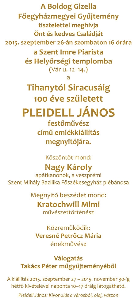 A Boldog Gizella Főegyházmegyei Gyűjtemény Pleidell János képeiből rendez emléktárlatot a festőművész születésének századik évfordulója alkalmából. A kiállítás helye a Szent Imre Piarista és Helyőrségi Templom. A megnyitót 26-án, 16 órakor tartják. A válogatás november 30-ig látható hétfő kivételével naponta, 10-től 17 óráig.