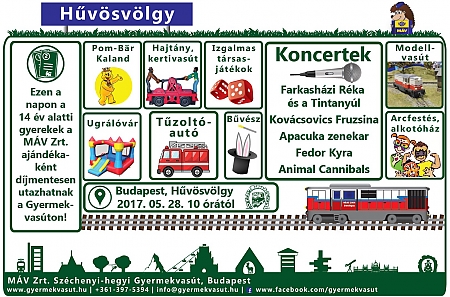 Május 28-án, a gyereknapon a 14 éven aluliak díjmentesen utazhatnak a Széchenyi-hegyi Gyermekvasúton, a vonatok 30-45 percenként járnak. Az élményekkel teli utazáson kívül Hűvösvölgy állomáson egész nap színpadi programokkal kedveskednek a látogatóknak. Az Apacuka zenekar, az Animal Cannibals, Kovácsovics Fruzsina, Fedor Kyra és Farkasházi Réka is fellép; a zenei programok mellett a vasútállomáson kertivasutazhatnak, hajtányozhatnak a gyerekek, de számos más érdekességgel (bűvész, ugrálóvár, modellvasút, tűzoltóautó) is kedveskednek a vendégeknek. A Gyermekvasút történetét bemutató kiállítás ismét várja a látogatókat.