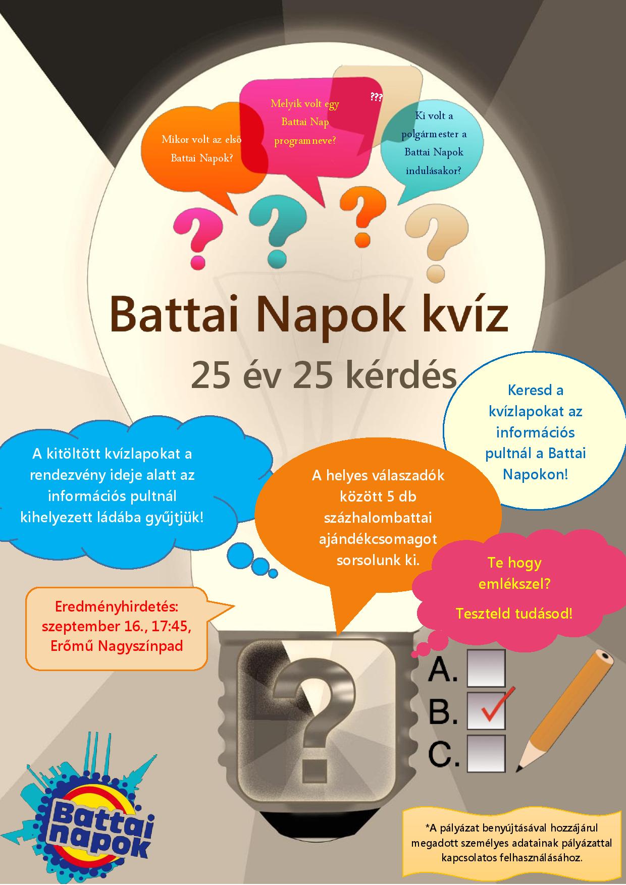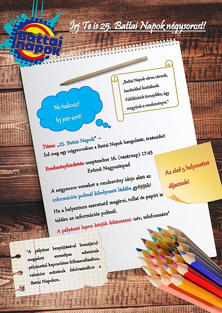 Aki nem szeret vagy akar hosszan mesélni, négysorossal is megemlékezhet a jubileumról. A hangulatokat, érzéseket kifejező rövid műveket a rendezvény ideje alatt lehet bedobni az információs pultnál kihelyezett ládába. Ugyancsak a rendezvény alatt, az információs pultnál lehet kitölteni a 25 kérdésből álló Battai Napok kvízt. Mindkét játék első öt helyezettje százhalombattai ajándékcsomagot kap. Az eredményhirdetés szeptember 16-án, vasárnap 17 óra 45-kor lesz a nagyszínpadon.