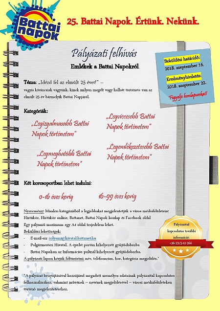 "Idézd fel az elmúlt 25 évet!" – erre kérik a játékos kedvű városlakókat. A feladat egy rövid elbeszélés, történet írása az elmúlt negyed században zajlott Battai Napokról. Nevezni két korcsoportban – 0-tól 16 és 16-tól 99 éves korig - és négy kategóriában – legizgalmasabb, legmeghatóbb, legviccesebb, legemlékezetesebb - lehet. A történetek kapcsolódhatnak bármelyik évhez, lehetnek megéltek vagy csak hallottak. A terjedelem maximálisan egy A/4 oldal. A legjobb történetek megjelennek a Hírtükörben, a városi honlapon és Facebook oldalon. A beküldési határidő szeptember 16.