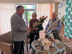 Két szépkorú városlakót köszöntött az Önkormányzat nevében Vezér Mihály polgármester, aki a jókívánságok mellett ajándék kíséretében átadta a miniszterelnöki emléklapot is.