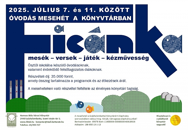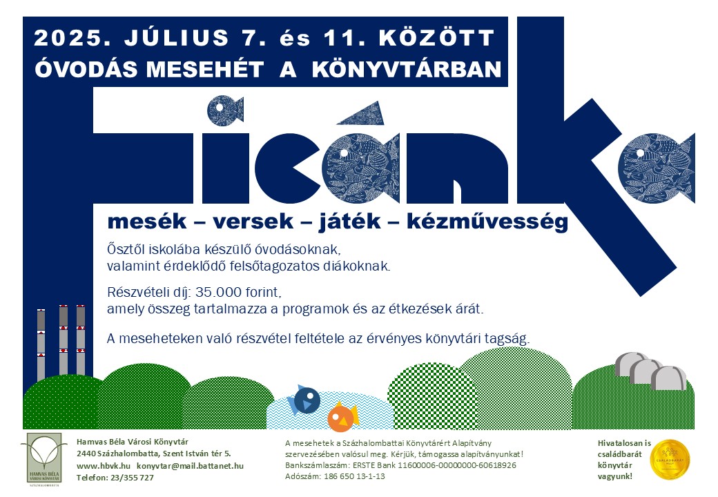 Július 7. és 11. között az iskolába készülő, nagycsoportos óvodásoknak és felsőtagozatosoknak szól a FICÁNKA tábor. A két korosztályt a helytörténeti értékek kötik össze. A tábor tematikája: Százhalombatta vizes élőhelyeinek megismerése, mesékkel, versekkel, kézműveskedéssel, sok-sok játékkal, valamint a Campona-Tropicarium meglátogatása is szerepel a programban.