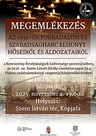A Keresztény Értelmiségiek Szövetsége százhalombattai szervezete az 1956-os forradalom és szabadságharc áldozataira emlékezik a Szent István téri kopjafánál, november 4-én 19 órától.