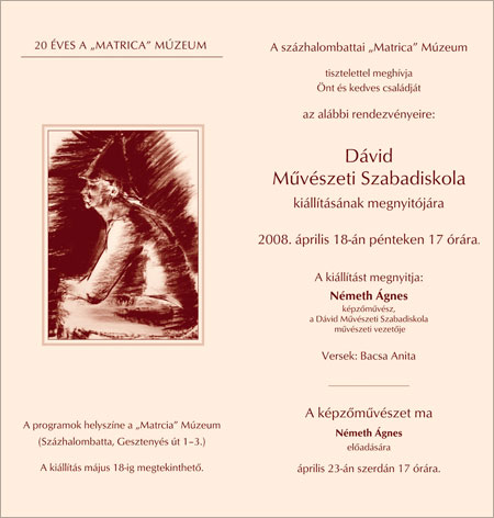 A Dávid Művészeti Szabadiskola kiállítása nyílik meg a „Matrica” Múzeumban április 18-án, 17 órakor. A tárlatot Németh Ágnes képzőművész nyitja meg, aki a rendezvényhez kapcsolódva április a „Képzőművészet ma” címmel előadást tart a múzeumban április 23-án.