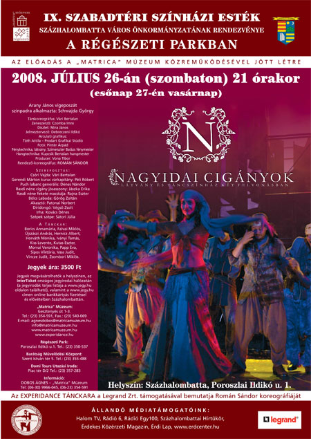 A színházi esték záró rendezvényére július 26-án 21 órakor kerül sor, ahol Román Sándor koreográfiáját a „Nagyidai Cigányok” című előadást mutatja be az Experidance Tánckara a Legrand Zrt. támogatásával.