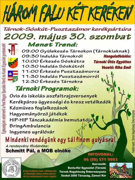 Tárnok lesz a házigazdája a „Három Falu Két Keréken” elnevezésű, immáron 6 éves hagyománnyal bíró, három település összefogásával létrejött sportrendezvénynek május 30-án. Az egész napos kerékpártúra és rendezvény mind Tárnok, mind Sóskút és Pusztazámor számára kiemelt jelentőségő. A résztvevők élő láncként kötik össze a három települést kerékpáron. A program célja a települések közötti civil összefogás megmutatása és a sport, az egészséges életmód népszerűsítése. A rendezvény fővédnöke Schmitt Pál, a Magyar Olimpiai Bizottság elnöke.