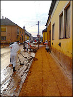 Kis csapatunknak a Szent Imre út központból induló, patakig tartó szakaszának takarítása volt a feladata. Kaptunk mindenféle védőfelszerelést, lapátot, talicskát és műanyag vödröket, amelyekbe összegyűjtöttük a vörösiszapot és raktuk a konténerekbe.