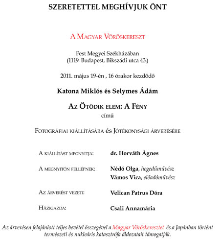 Fotókiállítást és jótékonysági árverést rendez a Magyar Vöröskereszt Pest Megyei Szervezete székházában (1119 Budapest, Bikszádi utca 43.) május 19-én, 16 órakor. Katona Miklós és Selymes Ádám Az ötödik elem: A Fény című fotográfiáit láthatja a közönség. A művészek az árverésen befolyt összeget a Magyar Vöröskeresztnek ajánlják, amivel a japán természeti és nukleáris katasztrófa áldozatait kívánják segíteni.