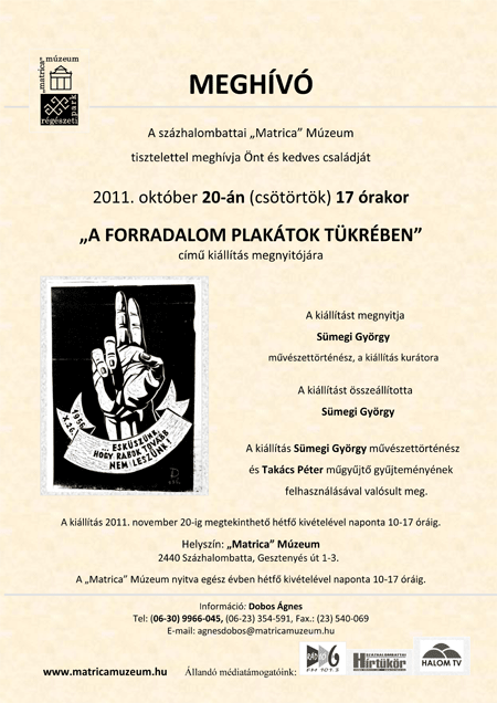 Százhalombattán a „Matrica” Múzeumban is megemlékeznek az 1956-os forradalomról és szabadságharcról. Október 20-án, 17 órakor nyílik A forradalom plakátok tükrében című időszaki kiállítás, amely 1956 plakátjait mutatja be. A kiállítást Sümegi György művészettörténész állította össze, és ő is nyitja meg.
