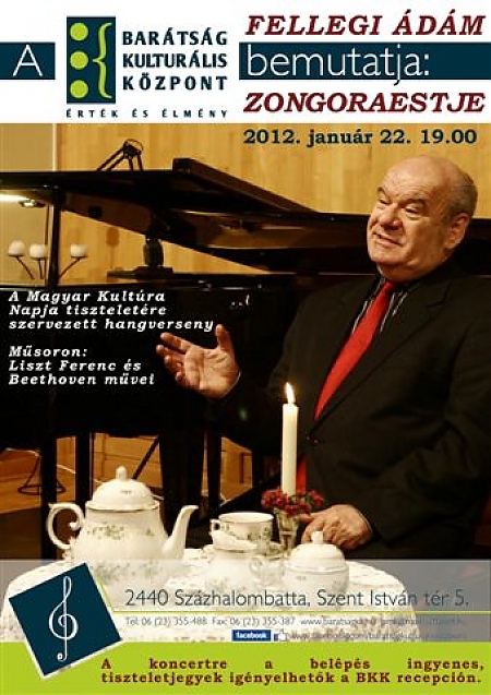 A január 22-i rendezvények sorát 19 órakor Fellegi Ádám zongoraművész ünnepi koncertje zárja a színházteremben. A Liszt-díjas zongoraművész Beethoven és Liszt Ferenc műveiből ad elő. Az ingyenes tiszteletjegyek a BKK recepcióján vehetők át.