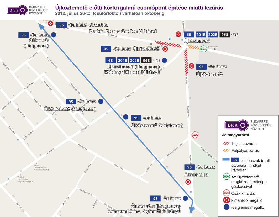 Július 26-án, csütörtökön reggel 8 órától a Jászberényi út irányában ismét eredeti útvonalukon közlekednek majd a 68-as, a 201E, a 202E és a 968-as autóbuszok, ezért Új köztemető megállójuk visszakerül az eredeti helyére. A Kispest irányába közlekedő buszok Új köztemető elnevezésű megállóját ugyanakkor a fenti időponttól várhatóan októberig 80 méterrel hátrébb, az Újhegyi útra, a Sírkert úti kereszteződés utánra helyezzük át.