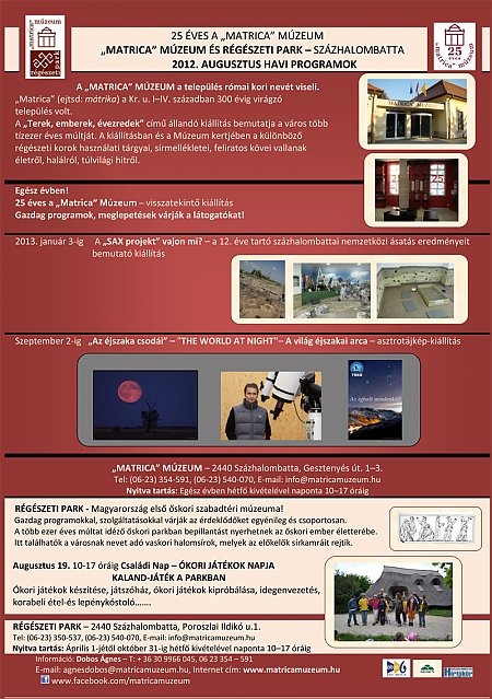 A városban lévő "Matrica" Múzeum (ejtsd: mátrika) a város több tízezer éves múltját bemutató "Terek, emberek, évezredek" című állandó kiállítása, az éjszaka csodái asztro-fotókiállítás és a nap témájához kapcsolódó "A SAX projekt vajon mi?" című, 12 éve zajló nemzetközi ásatást bemutató kiállítás várja a látogatókat!