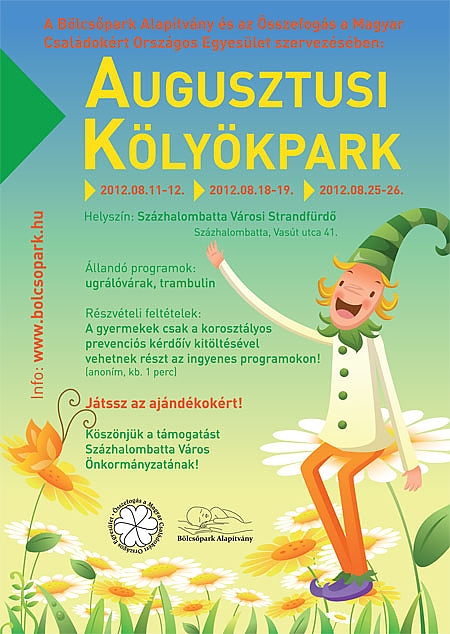 Bojtorján együttes, Tordasi Szivárvány Zenekar, Esztrád Színház és Színházikó Társulat, mese, koncert, kézműves-foglalkozások, pónilovaglás, ugrálóvár és trambulin vár a gyerekekre hétvégenként a százhalombattai városi strandon a Bölcsőpark Alapítvány és az Összefogás a Magyar Nagycsaládosokért Országos Egyesület „Augusztusi Kölyökpark” rendezvényén.