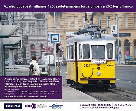 Az első budapesti villamos 125 évvel ezelőtt, 1887. november 28-án délután indult első útjára a Nyugati tér és a Király utca közötti útvonalon – Európában ez volt az első városon belüli, közúti villamosvasút. A nevezetes évforduló előtt tisztelegve ma, 2012. november 28-án a 2624-es pályaszámú nosztalgiavillamos közlekedik a világ egyik legszebb villamosvonalaként számon tartott 2-es villamos útvonalán, a Jászai Mari tér és a Közvágóhíd között.