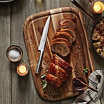 A pulykamell tekercseket ferdén szeletelve, az almás tócsnival és a fűszeres mártással tálaljuk.