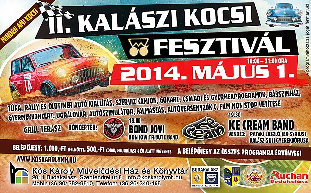 Május elsején újra dübörög a Budakalászi Kocsifesztivál gyerekprogramokkal, dögös verdákkal és rockkal. Túra-, rally- és oldtimer kiállítás, szervízkamion, gokart, családi és gyermekprogramok, autószimulátor, makettek, ugrálóvár, falmászás, filmvetítés, grillterasz és koncertek kifulladásig.
