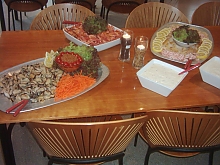 Az üzemlátogatás után visszamentünk az étterembe, ahol már várt minket a vacsora. Jellemzően halak, kagylók és jobbnál jobb dán ételek. Már kezdtem pánikba esni, amikor találtam némi sültoldalast és saslikot meg főtt krumplit. Nem kis mázli, ha inni már csak sört lehet. (Ez így nem igaz, volt például Jolly Cola is. Pazar!!)